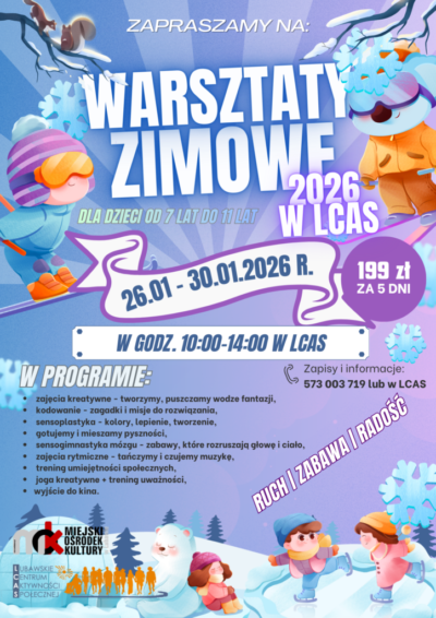 Ferie zimowe pełne zabawy i kreatywności! Zapraszamy dzieci w wieku 7–11 lat na Warsztaty Zimowe…