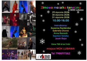 Zimowa Mozaika Taneczna w MOK Lubawa Ferie na parkiecie? Zdecydowanie TAK! Zapraszamy na intensywne 3…