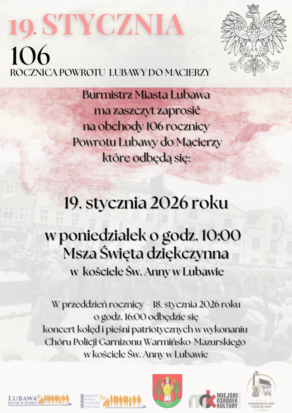 Upamiętniając wydarzenia sprzed 106 lat, które przywróciły Lubawę do Macierzy, zapraszamy mieszkańców do wspólnego udziału…