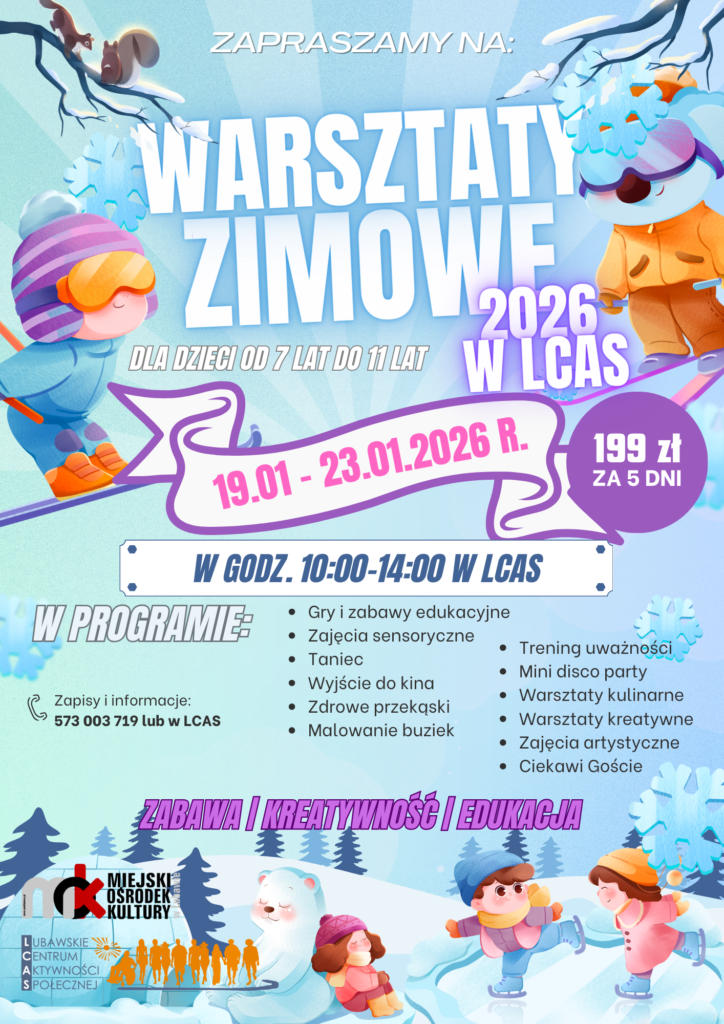 Zapraszamy dzieci w wieku 7–11 lat na Warsztaty Zimowe 2026 w Lubawskie Centrum Aktywności Społecznej – pięć dni pełnych radości, ruchu, twórczych zajęć i dobrej zabawy